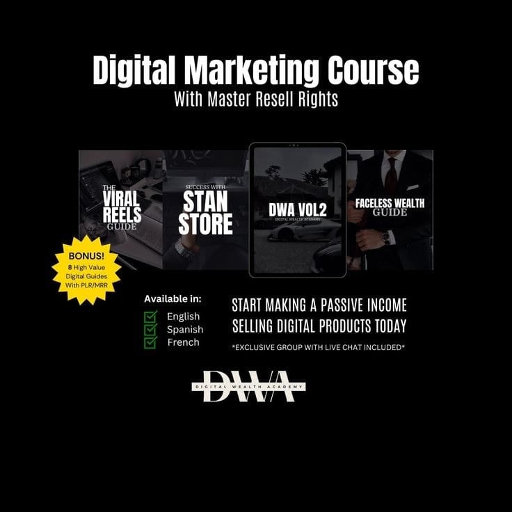 This is a comprehensive marketing course designed for beginners (even with no experience) to learn how to launch a successful digital marketing business. This is a DONE-FOR-YOU in-depth marketing course. The course includes step-by-step modules that will walk you through launching your digital product business and how to use digital marketing to make sales. You will learn how to brand yourself, create multiple streams of income, set up your automated income funnels, and advertise on various social media channels, and everything else you need to create a profitable online business. This product is unique because once you buy it you own it. This means you can re-brand and sell it for 100% profit. All future updates on DWA are free and new modules are being updated on a regular basis.
